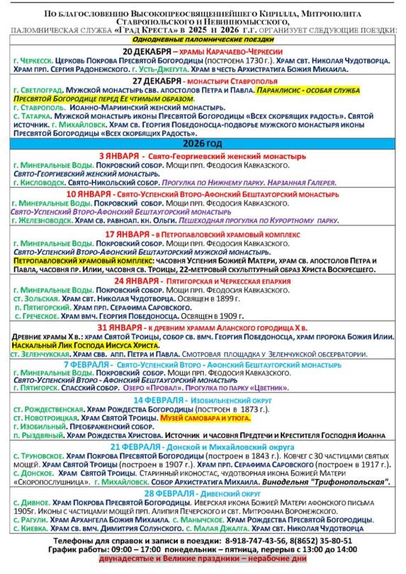 В 2025 и 2026 году паломническая служба Ставропольской епархии «Град Креста» организует однодневные и двухдневные поездки по святым местам.