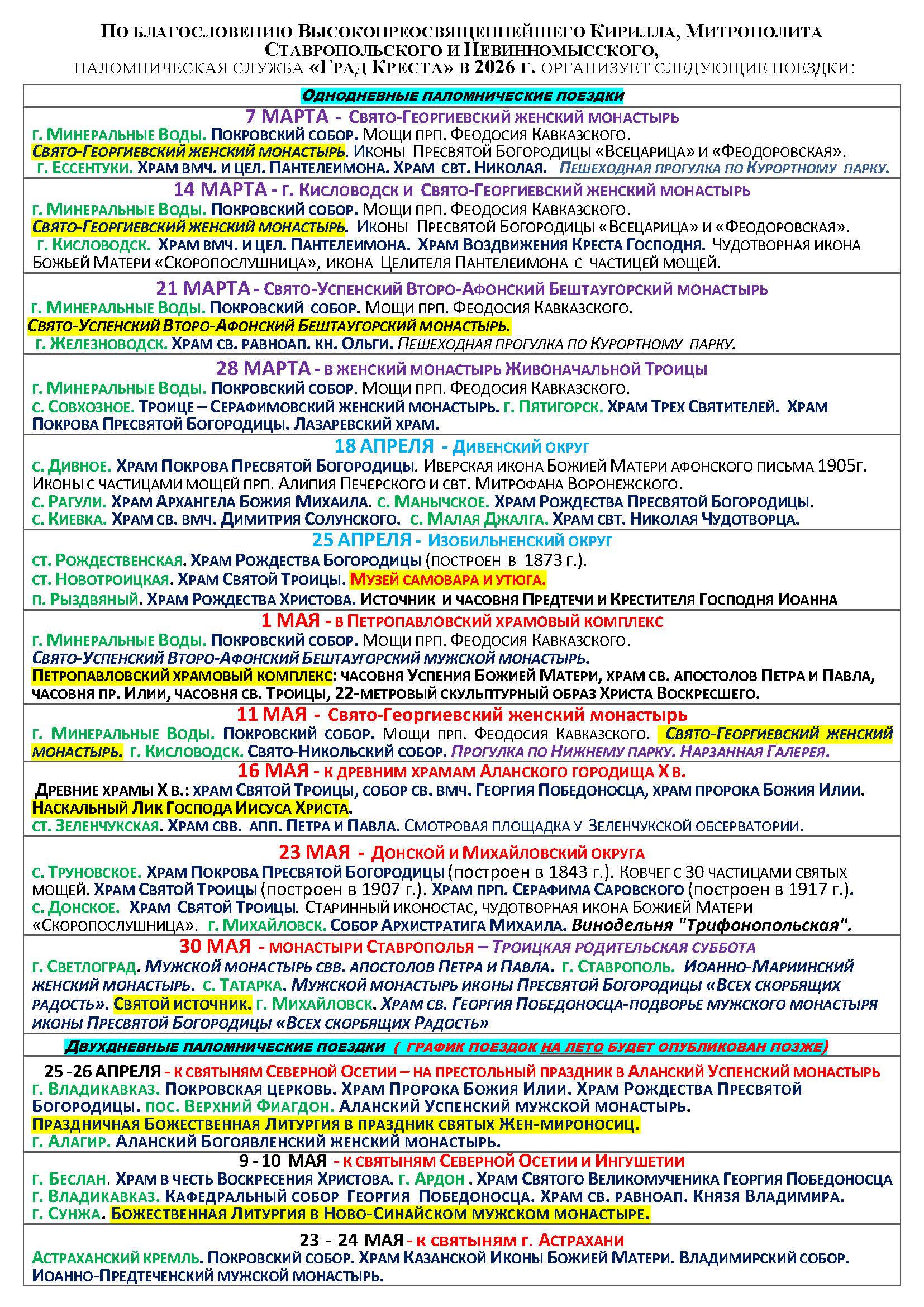 В 2026 году паломническая служба Ставропольской епархии «Град Креста» организует паломнические поездки по святым местам.